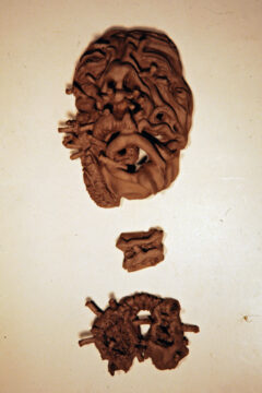 1988. Unfired clay; cigarette butts. 28″ x 20″ (3 pieces)