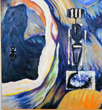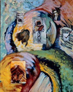 1991. Mixed Media (oil over collage; canvas strips). 60″ x 48″